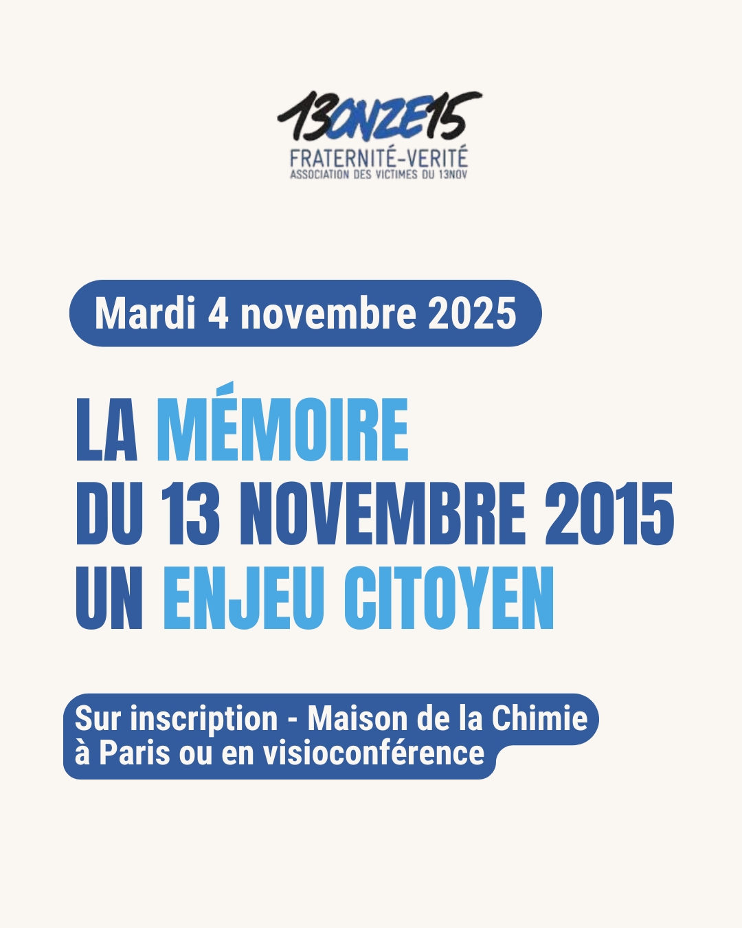 Dix ans après les attentats du 13 novembre 2015 à Paris et Saint-Denis, l’association 13onze15 – Fraternité et Vérité organise une journée exceptionnelle rythmées par 3 tables rondes le mardi 4 novembre 2025, de 9h à 19h, à la Maison de la Chimie à Paris (également en visioconférence). Cet événement vise à comprendre les causes de ces attaques, à réfléchir sur leurs conséquences et à défendre le devoir de mémoire dans une démarche citoyenne.